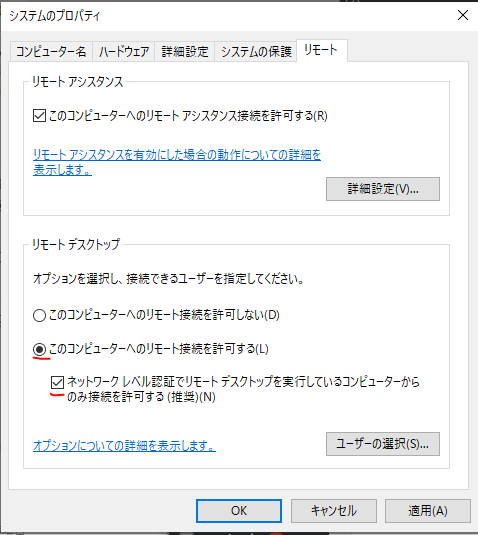 - 「ネットワーク認証レベルでリモートデスクトップを実行しているコンピューターからのみ接続を許可する」のチェックを「ON」