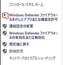 - コントロールパネル > システムとセキュリティ > Windows Defender ファイアウォール > Windows Defender ファイアウォールを介したアプリまたは機能を許可 をクリック