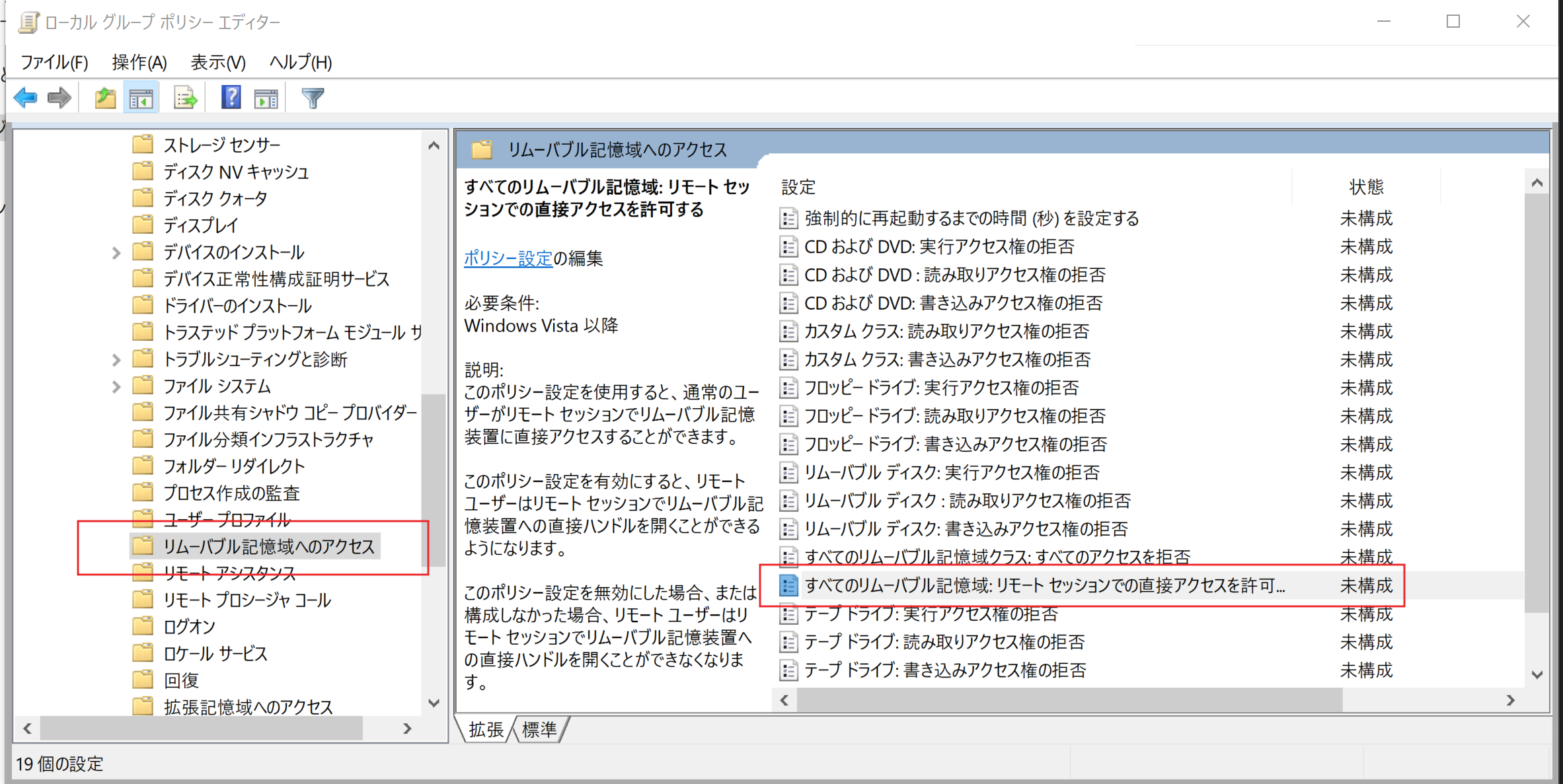 システム > 管理用テンプレート > システム > リムーバブル記憶域へのアクセス を開きます。