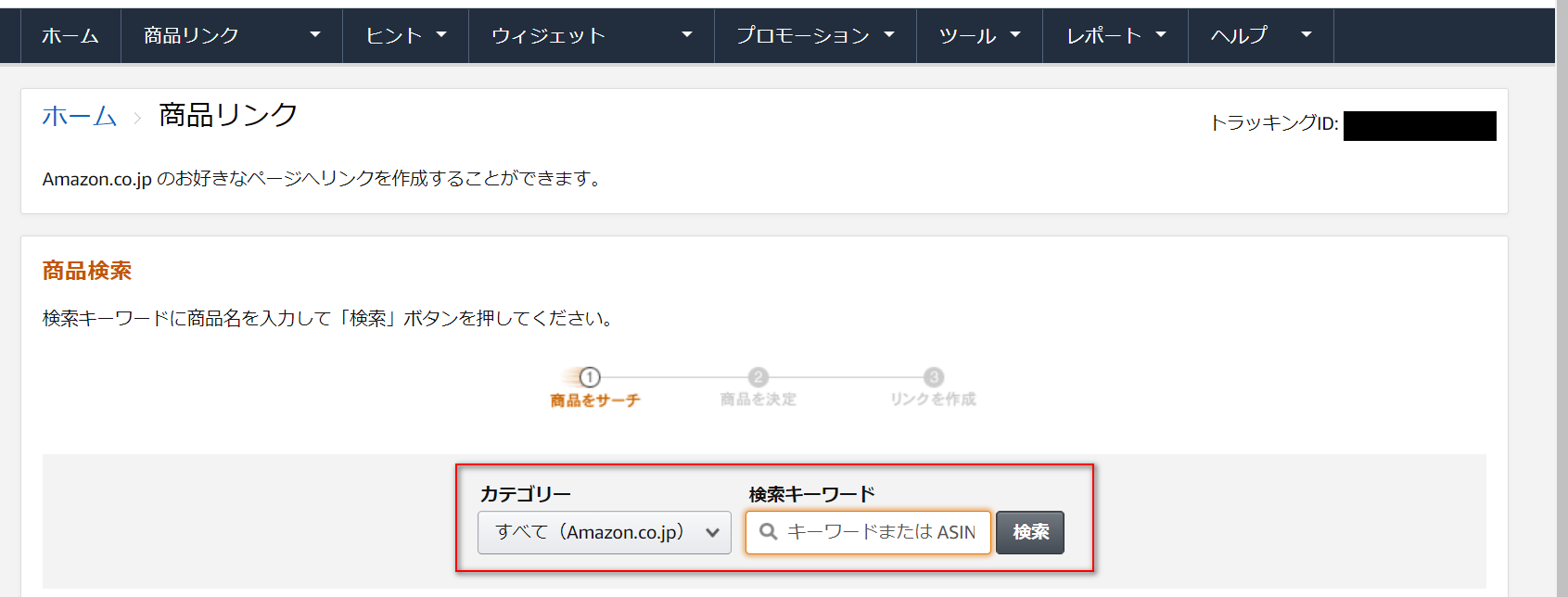 Amazonアソシエイトの「商品サーチ」ページに移動します。